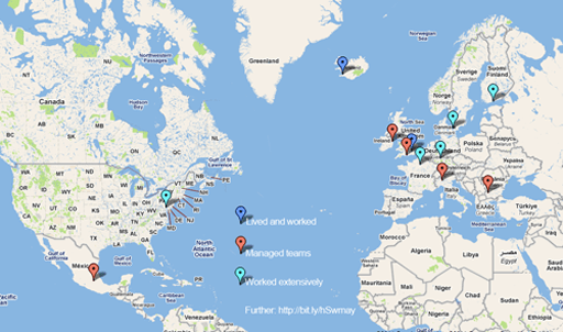 Kort sem sýnir hvar ég hef búið og hvar ég hef leitt teymi. Smellið á kortið til að fá nánari skýringar.